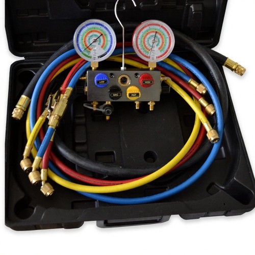 Манометрический коллектор Mastercool 96261-MB — профессиональный четырёхвентильный комплект американского производства, поставляемый в удобном пластиковом кейсе с набором шлангов. Предназначен для обслуживания систем кондиционирования и холодильных установок на хладагентах R134a, R22, R407C, R404A и R507.