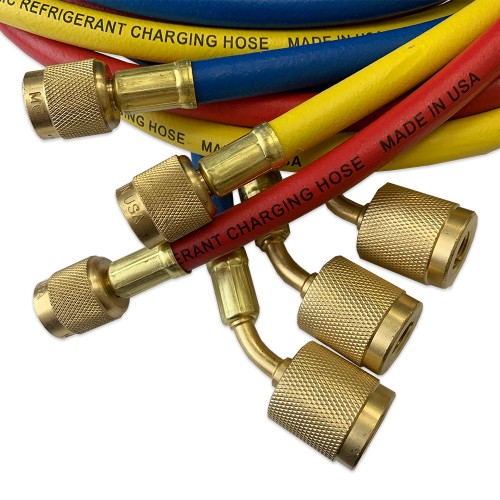 Профессиональный комплект заправочных шлангов Mastercool 45336 длиной 90 см предназначен для обслуживания и заправки систем кондиционирования и холодильного оборудования. Главная особенность набора — встроенный обратный клапан, который пропускает фреон строго в одном направлении и предотвращает его обратный выброс. На корпусе клапана нанесена стрелка, указывающая правильное направление потока.