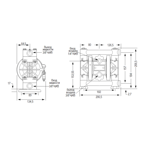 Габаритный чертеж насоса Graco HUSKY 307-PP-PP-SP-SP