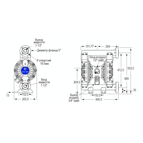 Всасывающий и напорный патрубки — 1 1/2" (40 мм), фланец ANSI. Подключение сжатого воздуха — 1/2" NPT. Насос способен работать в режиме самовсоса до 6,1 м.