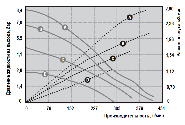 - Производительность: 1–22,7 м³/ч (16–378,5 л/мин)