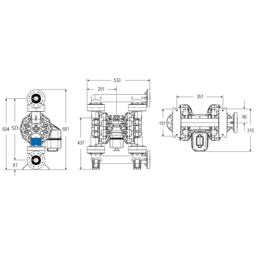 Мембраны выполнены из PTFE (со стороны жидкости) и Santoprene (со стороны воздуха). Седла клапанов — из PVDF, шариковые клапаны — из тефлона. Насос работает от энергии сжатого воздуха при входном давлении от 1,4 до 8,6 бар.