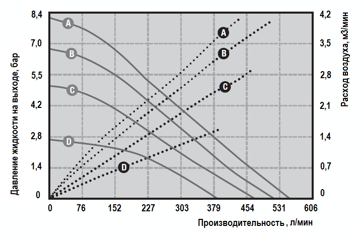 | Производительность | 1 – 34,1 м³/ч (16 – 568 л/мин) |