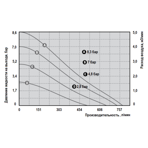 | Производительность | 1 – 45,4 м³/ч (16 – 757 л/мин) |
