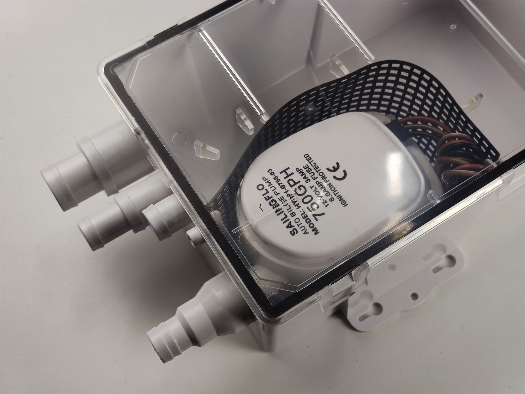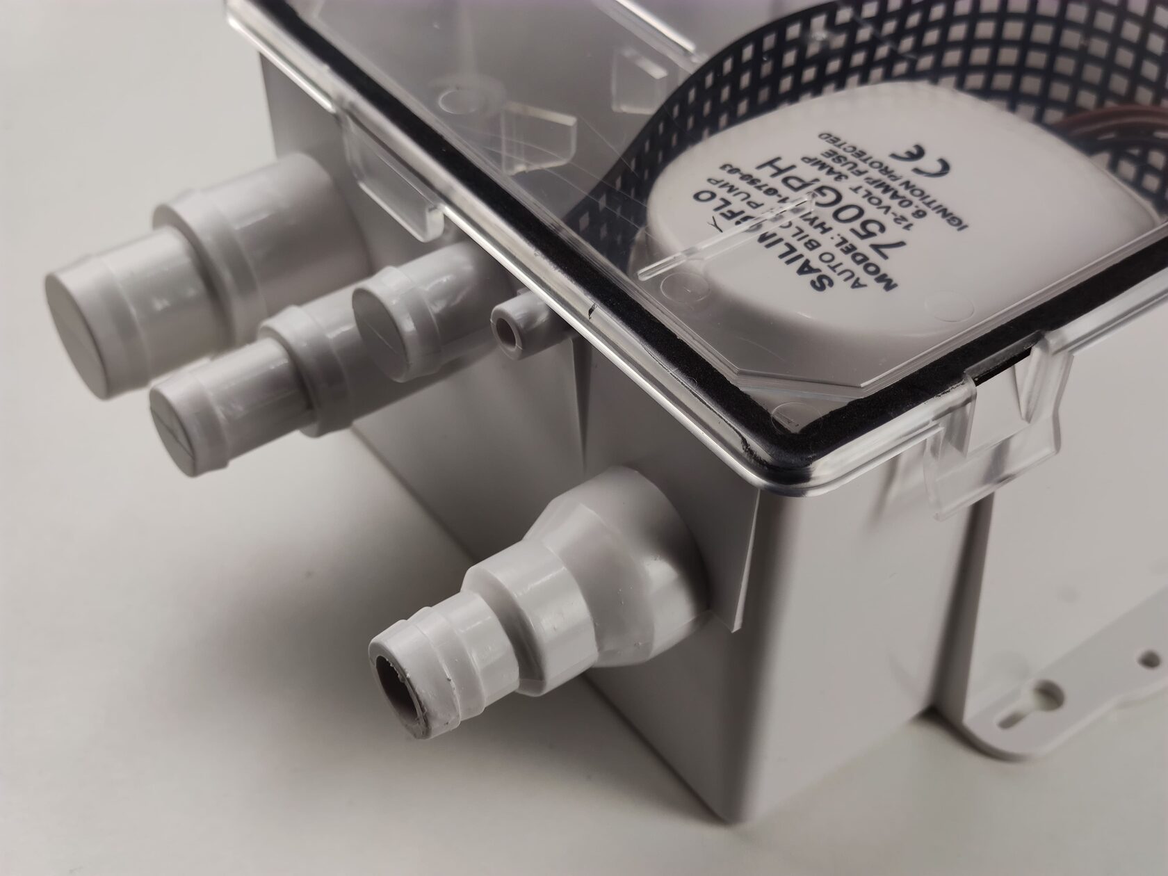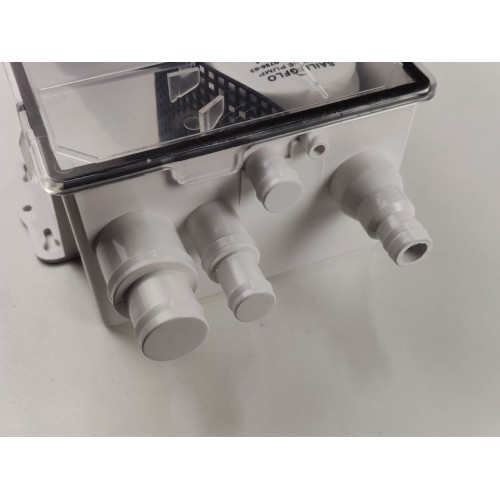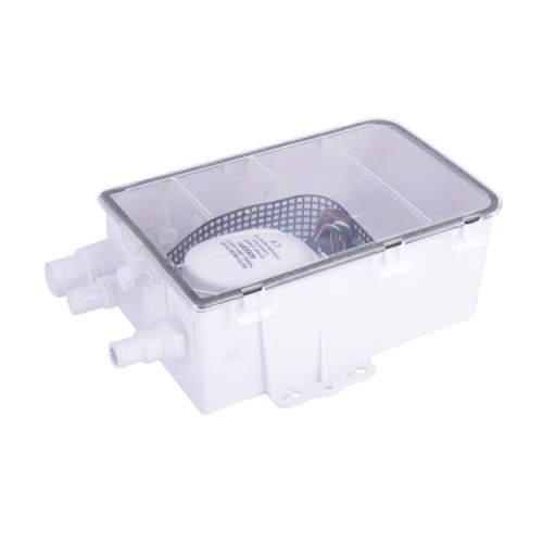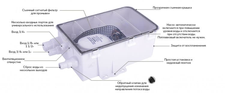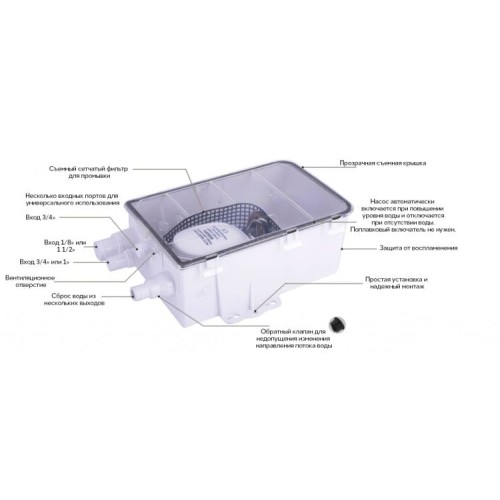 Насос включается при достижении определенного уровня воды в баке и выключается, когда вода почти полностью удалена. Оснащен обратным клапаном для предотвращения обратного потока, а также сетчатым фильтром от мусора, который легко снимается для очистки. При необходимости насос можно снять и использовать отдельно как трюмный, что повышает универсальность применения.