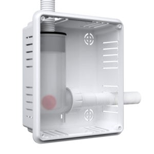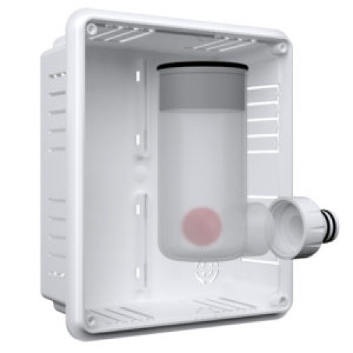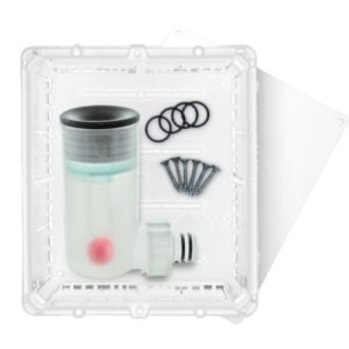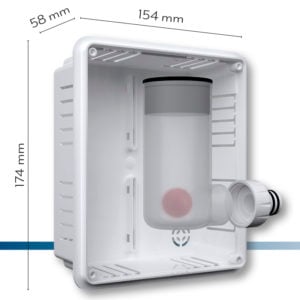 Главное преимущество — монтажный бокс с открывающейся крышкой. В отличие от сифонов, замурованных в стену, VECAMCO Mini остаётся доступным: его можно открыть, проверить состояние, очистить или заменить при необходимости. Это увеличивает срок службы всей дренажной системы и упрощает обслуживание.